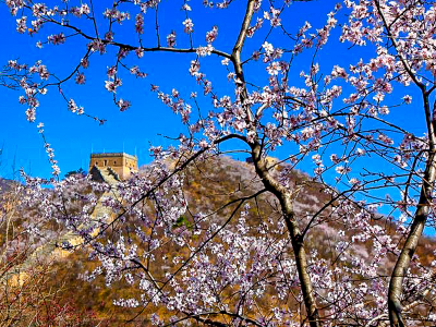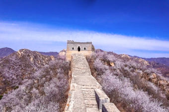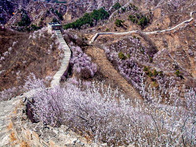 - 龙泉峪野长城绵延于崇山峻岭之上,一直延伸到远方,两侧大山上开满山桃花和杏花。满山遍野的山桃花摇曳生姿,就像上帝之手撒了一把花种子,在春风里发芽绽放。而古长城在山花和蓝天印衬下,不再显得那么苍凉悲壮,更加的神采奕奕,魅力四射。