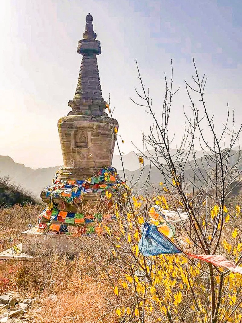 若从广智禅寺穿越过来会路过一座过街塔基座遗存,《门头沟文物志》上有该过街塔的老照片,从照片上可以看出,原在过街基座上建有覆钵式佛塔一座,现仅剩下孤零零的基座,周边有许多散落的石构件。