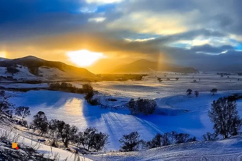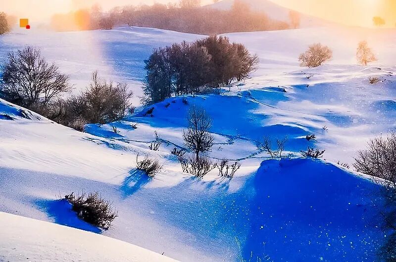 白云流淌,天空湛蓝,照射下的皑皑白雪,